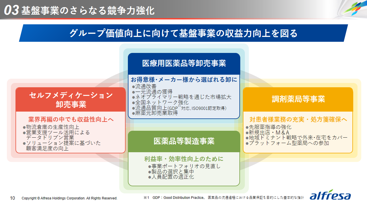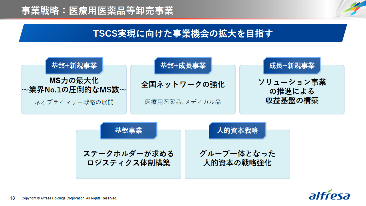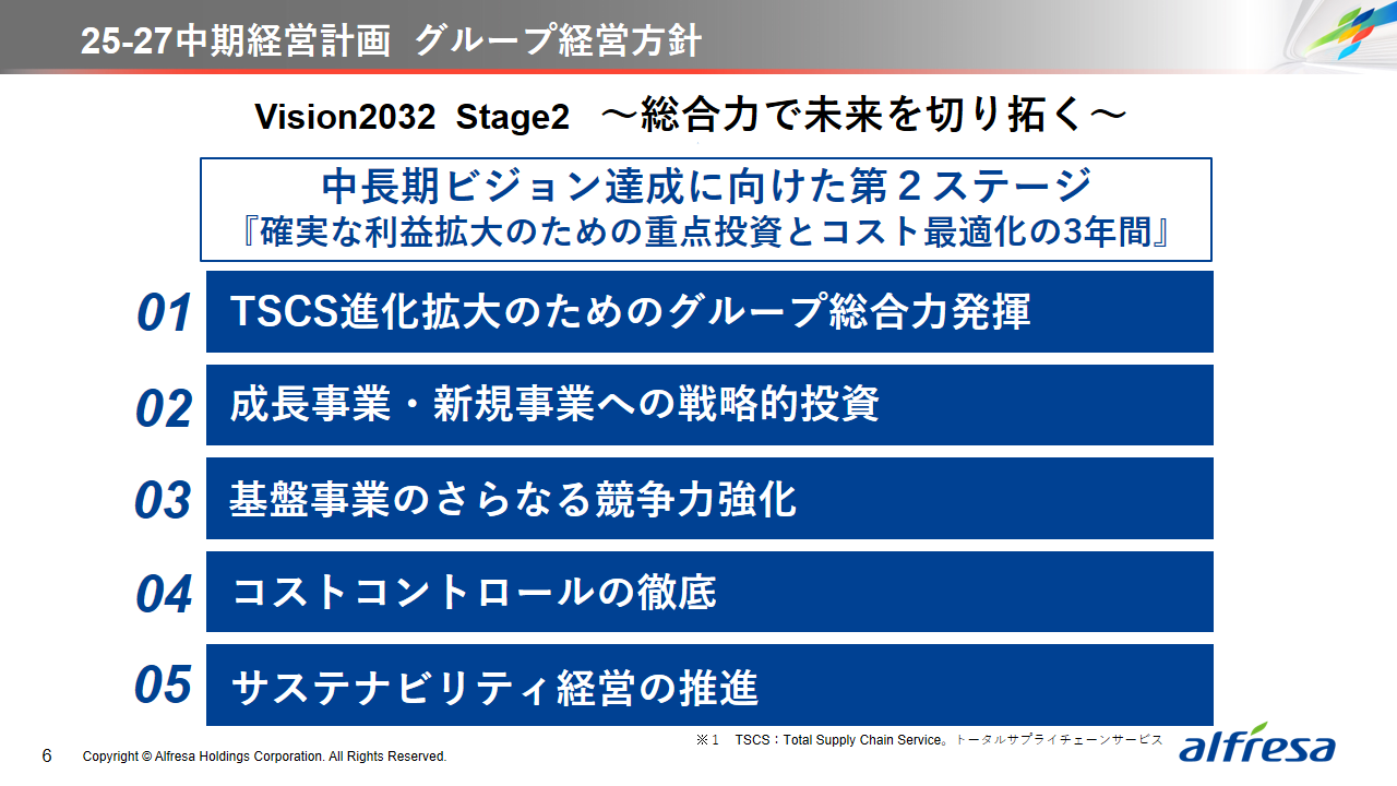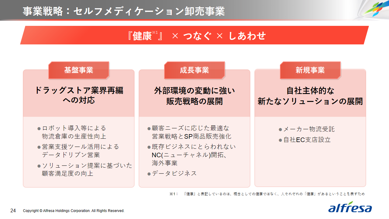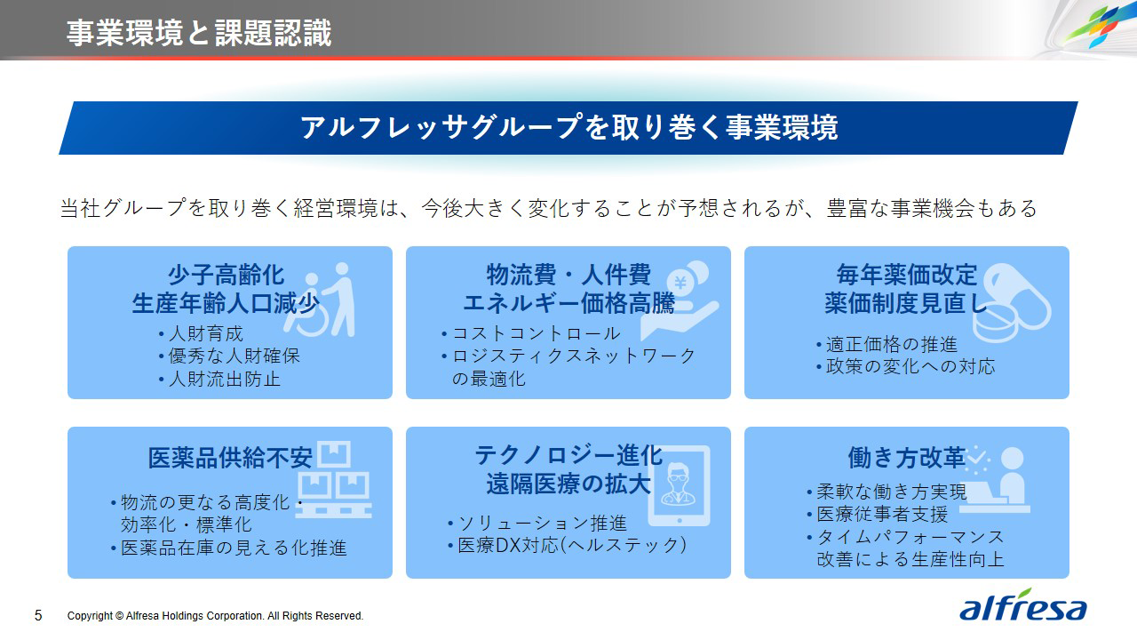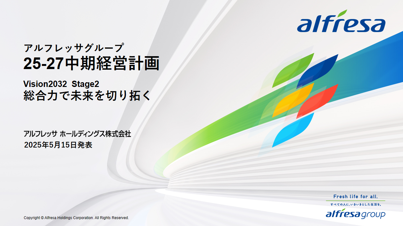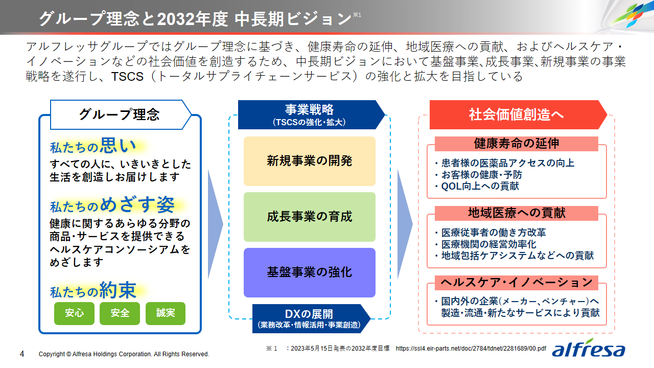 当社グループは、2023年に策定した2032年度までの中長期的な事業戦略および財務・資本戦略「アルフレッサグループ中長期ビジョン」において、グループ理念に基づき、健康寿命の延伸、地域医療への貢献、およびヘルスケア・イノベーションなどの社会価値を創造するため、基盤事業強化、成長事業育成、新規事業開発の事業戦略を遂行し、トータルサプライチェーンサービスの強化と拡大を目指しています。今回策定した「25‐27中計」は、「中長期ビジョン」の目標達成に向けた第2ステージであり、確実な利益拡大のための重点投資とコスト最適化により、これまでの取り組みを進化させてまいります。