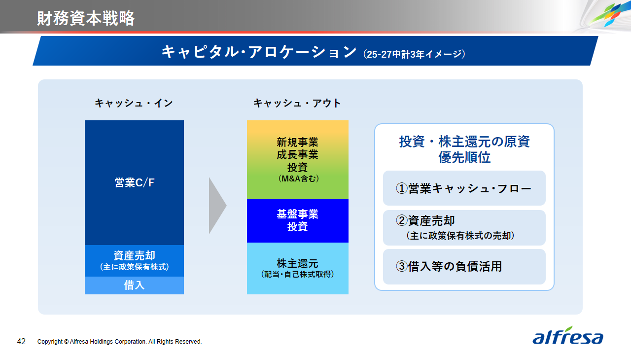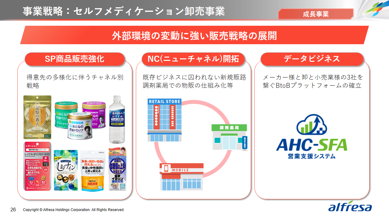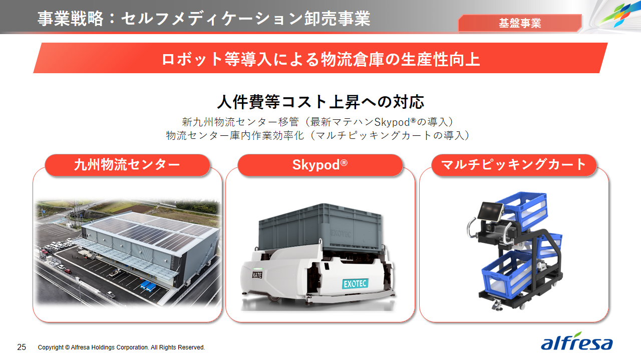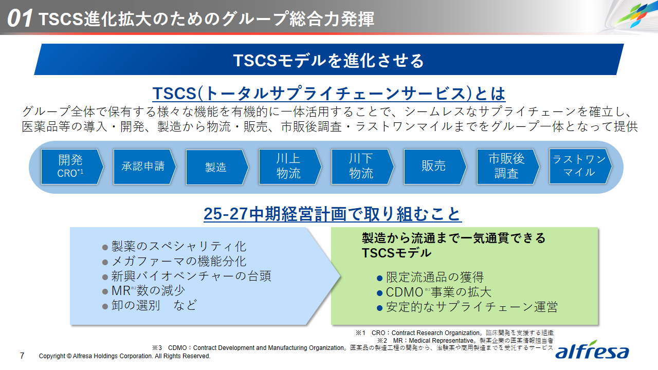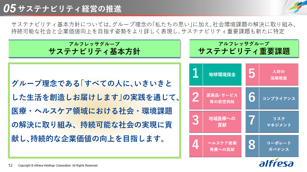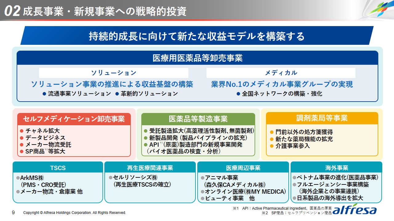 当社グループは、2023年に策定した2032年度までの中長期的な事業戦略および財務・資本戦略「アルフレッサグループ中長期ビジョン」において、グループ理念に基づき、健康寿命の延伸、地域医療への貢献、およびヘルスケア・イノベーションなどの社会価値を創造するため、基盤事業強化、成長事業育成、新規事業開発の事業戦略を遂行し、トータルサプライチェーンサービスの強化と拡大を目指しています。今回策定した「25‐27中計」は、「中長期ビジョン」の目標達成に向けた第2ステージであり、確実な利益拡大のための重点投資とコスト最適化により、これまでの取り組みを進化させてまいります。