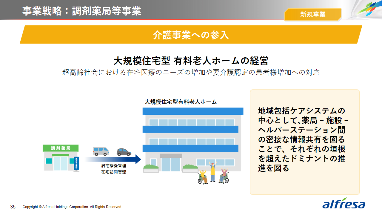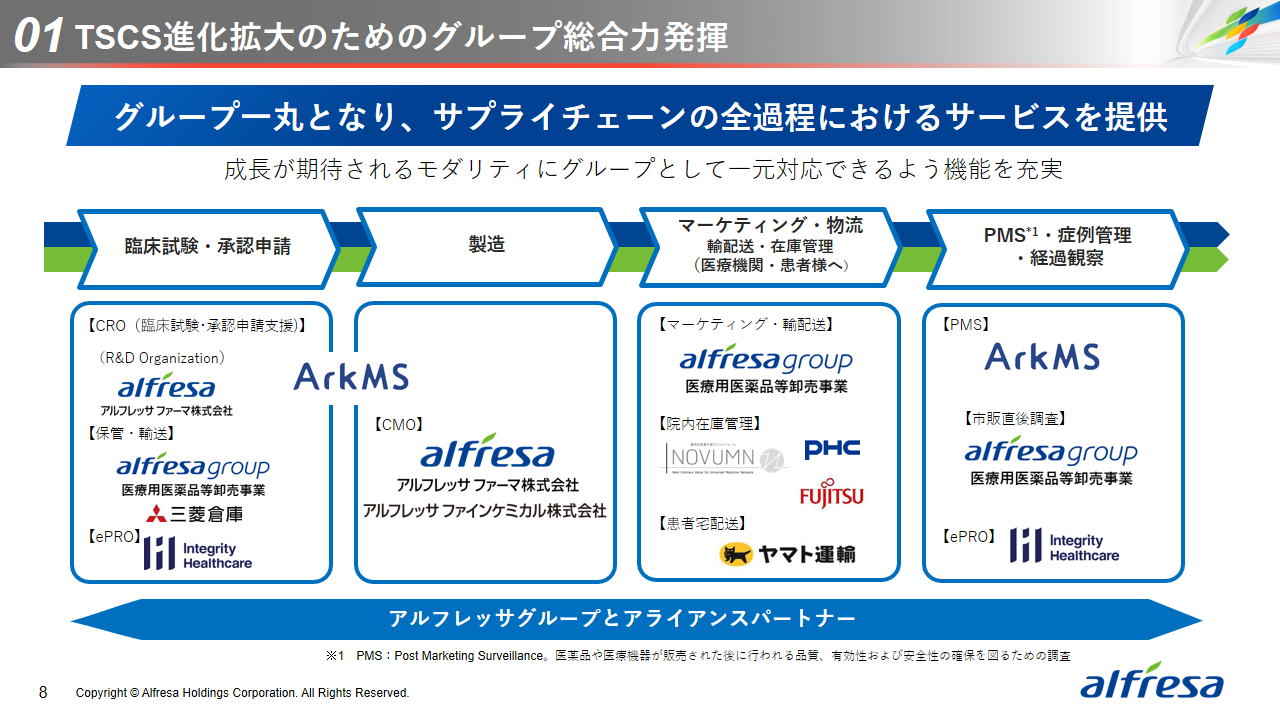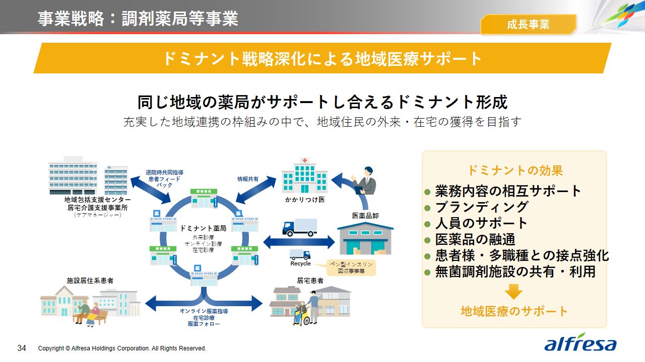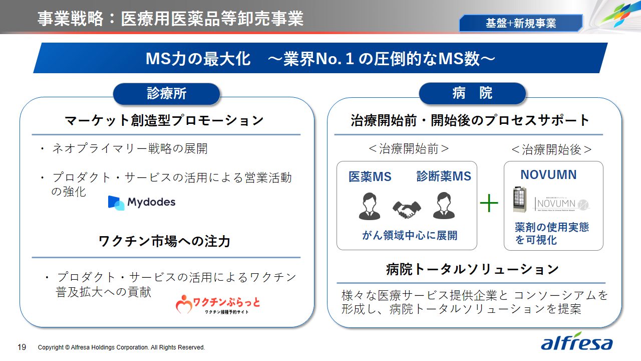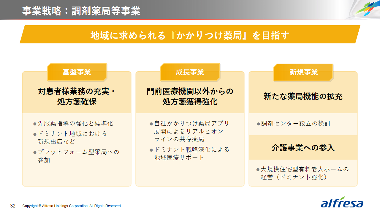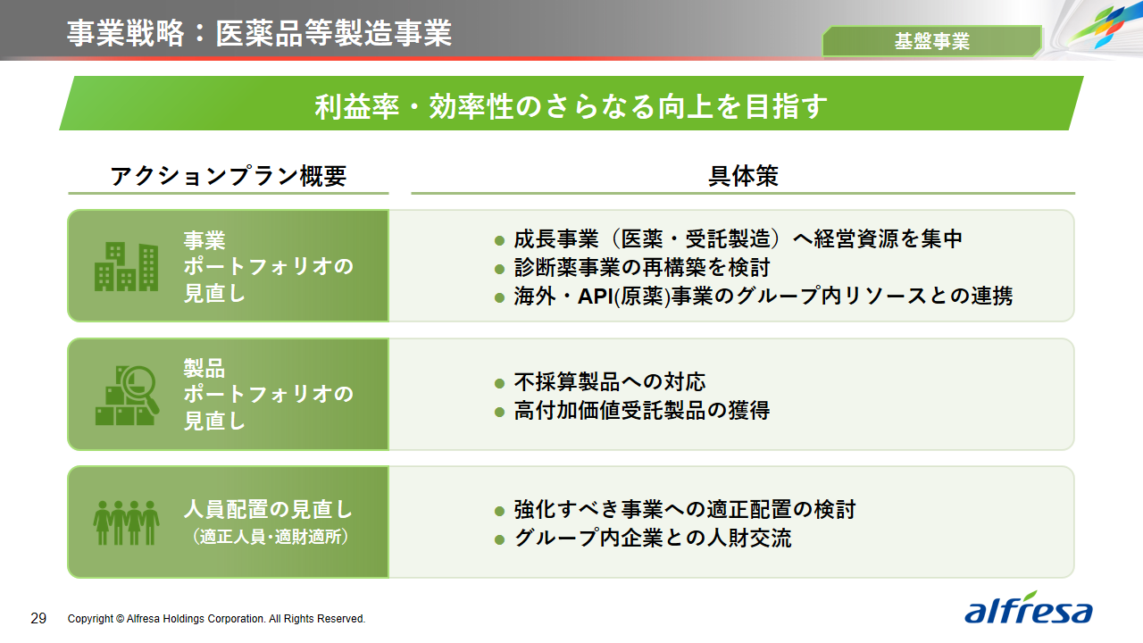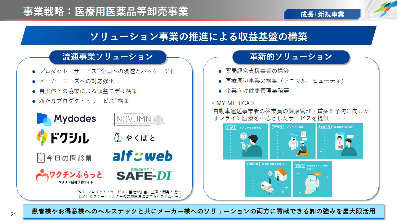 当社グループは、2023年に策定した2032年度までの中長期的な事業戦略および財務・資本戦略「アルフレッサグループ中長期ビジョン」において、グループ理念に基づき、健康寿命の延伸、地域医療への貢献、およびヘルスケア・イノベーションなどの社会価値を創造するため、基盤事業強化、成長事業育成、新規事業開発の事業戦略を遂行し、トータルサプライチェーンサービスの強化と拡大を目指しています。今回策定した「25‐27中計」は、「中長期ビジョン」の目標達成に向けた第2ステージであり、確実な利益拡大のための重点投資とコスト最適化により、これまでの取り組みを進化させてまいります。